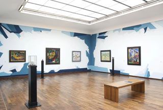 Im musealen Kontext gilt im Umgang mit historischen Werken, diese zu bewahren und zu pflegen und im Übrigen ihre Strahlkraft und Aussagemöglichkeit zu überlassen. Wir glauben aber, dass es auch einen anderen Weg im Umgang mit historisch gewordenen Kunstwerken gibt, nämlich den, sie in einen aktiven Diskurs mit heutigen künstlerischen Positionen zu bringen. 1992 haben wir deshalb die Ausstellungsräume des Blauen Reiter in starke, kräftige Farben getaucht, um so ein neues Bewusstsein und eine spannende Auseinandersetzung mit dem Bild und dem Ort seiner Präsentation in Gang zu bringen. Manches der damaligen Erfahrung hat sich bewährt, anderes musste revidiert werden. Allerdings ist inzwischen zu beobachten, dass unsere Auseinandersetzung mit der farbigen Gestaltung der Wände für die Kunst der Moderne häufig allzu leichtfertig imitiert, kopiert, manchmal sogar in verdrehter Form eingesetzt wurde. Unsere Entscheidung basierte auch auf dem Wissen, dass Wassily Kandinsky und Franz Marc in der ersten Ausstellung des Blauen Reiter in der Galerie Thannhauser in München 1911, die Farben der Wändverkleidung bewusst dunkel gewählt hatten, ohne dass wir genaue Auskünfte über die Farben dieser Wände hatten. Gleichzeitig standen uns farbige Raumschöpfungen von Blinky Palermo, Rupprecht Geiger, Gerhard Merz, Günther Förg und anderer vor Augen. Es handelte sich also um eine Art Rekonstruktion des ursprünglichen Ausstellungskontextes und war reine Entscheidung des Kurators.