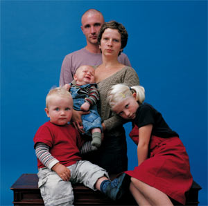Abbildung: Eva Mahn: Alex (25), Susanne (26), Anneliese (7), Valentin (11/2) und Jannis (2 Monate), 29. August 2001, aus der Serie "Heilige Familie", C-Print, 120 x 120 cm, Copyright Eva Mahn