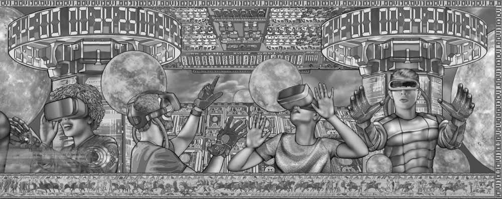 Nach historischem Vorbild lässt Eicher ihre „Medientapisserien®“ in einem industriellen Jacquard-Verfahren in Flandern weben und mit Bordüren umrahmen. 15 großformatige Wandteppiche mit Motiven virtueller Persönlichkeiten aus Film, Science-Fiction und Computerspielen sind ebenso zu sehen wie digitale Aquarelle der Serie „Aquaworld“ und die Installation „Amazing-Amazon-Stars“ (1999). Diese entstammt der langjährigen Werkgruppe „CopyCollagen“, in der Eicher fotografisches Bildmaterial zu potentiell unendlichen repetitiven Strukturen zusammengefügt hat. Das Hauptwerk der Ausstellung ist jedoch der 30 Meter lange Bildteppich „Battle:Reloaded“ (2022). Ein Werk, bei dem Margret Eicher auf den berühmten „Teppich von Bayeux“ aus dem 11. Jahrhundert zurückgreift. Mit der schwarzweißen Bildfolge gibt sie in diesem Großwerk ihren zeitaktuellen Figuren, unter ihnen Julian Assange, Lara Croft, Lady Gaga, die Ninja Turtles und Legosoldaten, ein neues Eigenleben.